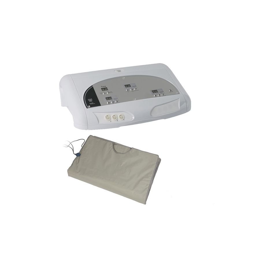 Se trata de un Equipo de Termoterapia con saco sauna, que actúa proporcionando un calor terapéutico con resultados directos sobre el organismo, entre los que destacan la vasodilatación, la oxigenación celular y la relajación muscular. El aparato cuenta con 3 canales que permiten regular la temperatura independientemente y trabaja a una Temperatura de 40-80ºC.