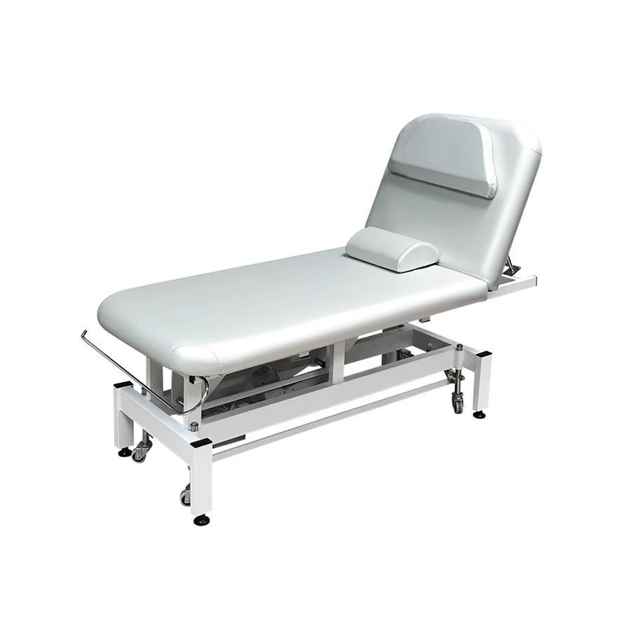 La camilla de masaje eléctrica está dividida en 2 secciones, dispone de estructura metálica muy estable y robusta, es regulable en altura, para lo que incorpora 1 Motor de elevación que controla la altura de la camilla (entre 65 y 80 cm) con mando alámbrico. Además, la camilla Optima tiene un reposacabezas extraíble con agujero facial y la inclinación de su respaldo es regulable mecánicamente hasta 75º. Por otra parte, la camilla dispone de una robusta estructura metálica con ruedas que facilitan su desplazamiento y ha sido diseñada con unos acabados de máxima calidad, un tapizado en PVC en blanco o gris, resistente al aceite y al agua y muy fácil para limpiar, y un acolchado de alta densidad.