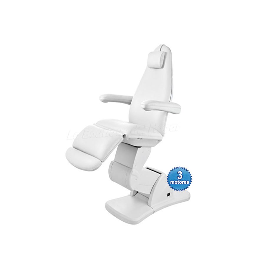 Esta camilla eléctrica está dividida en 3 secciones, y dispone de un gran confort gracias a que sus 3 motores controlan la altura, la inclinación del respaldo y la inclinación del asiento. Además, dispone de un reposapiés regulable mediante un pistón de gas, así como reposabrazos abatibles y reposacabezas con agujero facial. La Camilla ha sido diseñada con unos acabados de máxima calidad y cuenta también con tapizado blanco en PU de gran calidad y fácil limpieza así como un acolchado de alta densidad.