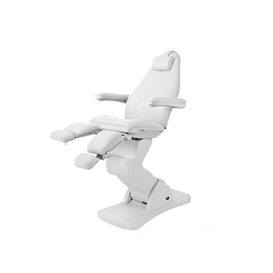 Este sillón camilla eléctrica de Podología está dividido en 3 secciones controlables mediante 5 motores, de manera que dispone de un gran confort gracias a que 3 de sus motores controlan la altura, la inclinación del respaldo y la inclinación del asiento. Además, dispone de un cuarto y un quinto motor que permite la regulación motorizada de la altura de ambos reposapiés de manera independiente, en lugar de ser regulado mediante pistón de gas como ocurre en el modelo 2244A de 3 motores. Esta camilla también dispone de reposabrazos abatibles y reposacabezas con agujero facial, ha sido diseñada con unos acabados de máxima calidad y cuenta también con tapizado blanco en PU de gran calidad y fácil limpieza así como un acolchado de alta densidad.