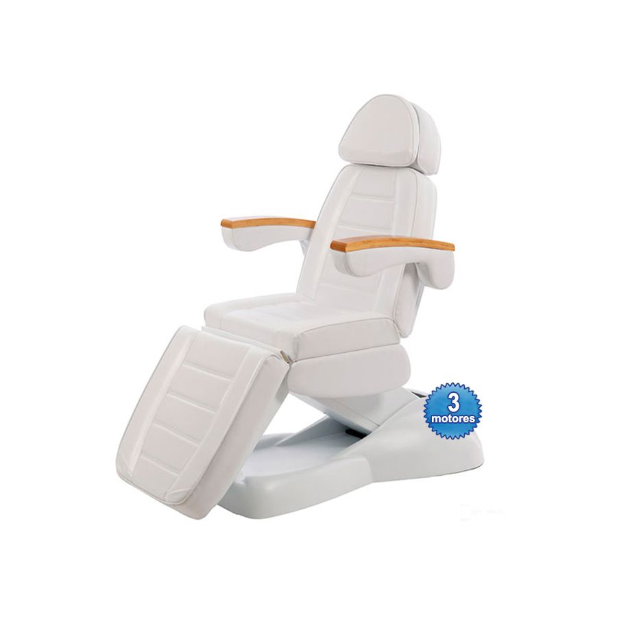 El sillón Camilla eléctrica está dividida en 3 secciones y es regulable en altura e inclinación, para lo que dispone de 3 Motores que controlan la altura, la inclinación del respaldo y del reposapiés. Además, la camilla cuenta con reposabrazos abatibles, reposacabezas regulable, con un práctico agujero facial y ha sido diseñada con unos acabados de máxima calidad, un tapizado en PVC color blanco que facilita su limpieza y un acolchado de alta densidad. Disponible también con 4 motores (modelo WKE015.4.A26), que permiten la regulación motorizada del asiento.