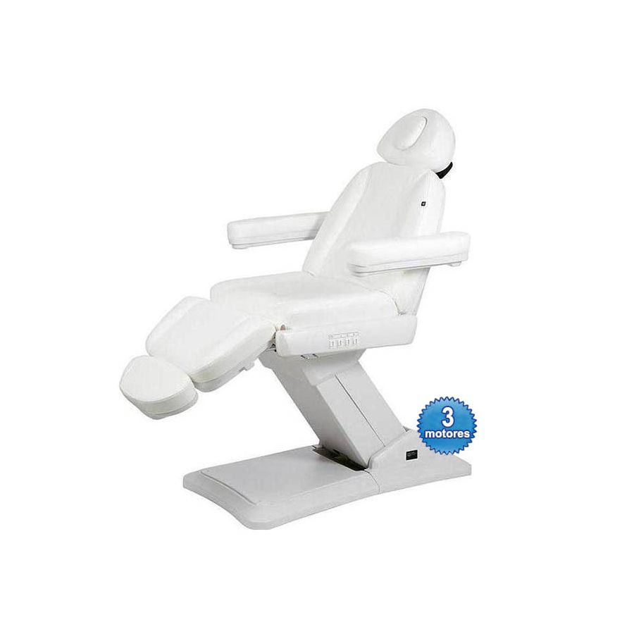 La camilla eléctrica está dividida en 3 secciones y dispone de un gran confort gracias a que sus 3 motores controlan la altura, la inclinación del respaldo y la inclinación del asiento. Además, dispone de un reposapiés regulable mediante un pistón de gas, así como reposabrazos reversibles y reposacabezas con agujero facial. La Camilla ha sido diseñada con unos acabados de máxima calidad y cuenta también con tapizado blanco en PU de gran calidad y fácil limpieza así como un acolchado de alta densidad.