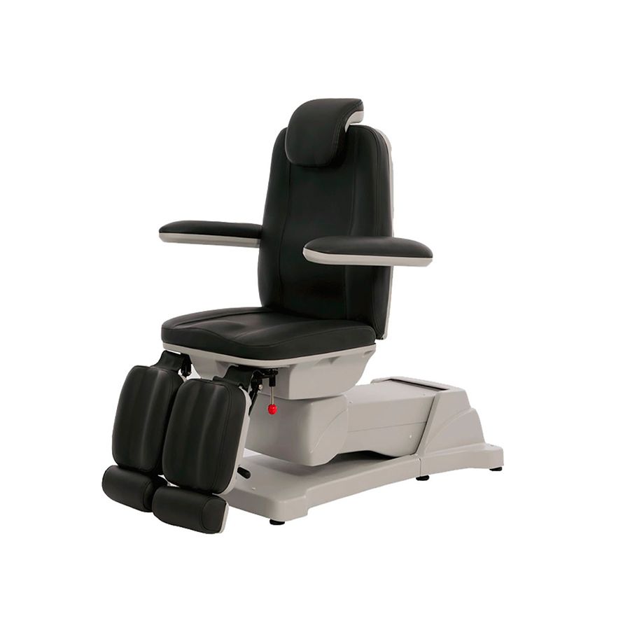 El sillón Camilla eléctrica está dividido en 3 secciones y es regulable en altura e inclinación, para lo que dispone de 3 Motores que controlan la altura, la inclinación del respaldo y del asiento. Además, la camilla cuenta con reposapiés ajustables en altura independientemente mediante pistón de gas con apertura lateral en dos posiciones prefijadas hasta 90°, así como reposabrazos abatibles y cojín reposacabezas ajustable en múltiples posiciones prefijadas. Un sillón de podología de alta calidad que ha sido diseñado con unos acabados de máxima calidad, un tapizado en PVC color gris oscuro que facilita su limpieza y un acolchado de alta densidad.