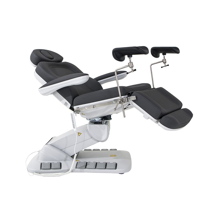 Este sillón camilla eléctrica de reconocimiento ginecológico de alta gama dispone de una estructura muy estable y es altamente configurable, ya que ha sido diseñada especialmente para optimizar el espacio de trabajo gracias a la rotación del sillón de 120°. La camilla de Ginecología Gyna está dividida en varias secciones, controlables mediante 4 motores, y otorga un gran confort gracias a que sus 4 motores son capaces de controlar todos los movimientos de la camilla, como son la altura, la inclinación del respaldo y del asiento, e incluso la del reposapiés. Todo ello controlable gracias a su mando de control o sus pedales integrados en el propio sillón, que permiten un total control de los movimientos desde cualquier punto de la camilla.