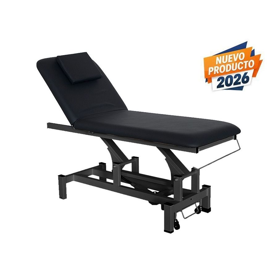 La camilla de masaje eléctrica está dividida en 2 secciones y es regulable en altura, para lo que dispone de 1 Motor de elevación que permite regular la altura de la camilla mediante la botonera integrada en la estructura. Además, el ángulo del respaldo es ajustable mediante pistón de gas. Por otra parte, la camilla dispone de un reposacabezas extraíble que deja al descubierto un practico agujero facial así como una robusta estructura metálica con ruedas escamoteables que facilitan su desplazamiento, y ha sido diseñada con unos acabados de máxima calidad, un tapizado en PVC y un acolchado de alta densidad.