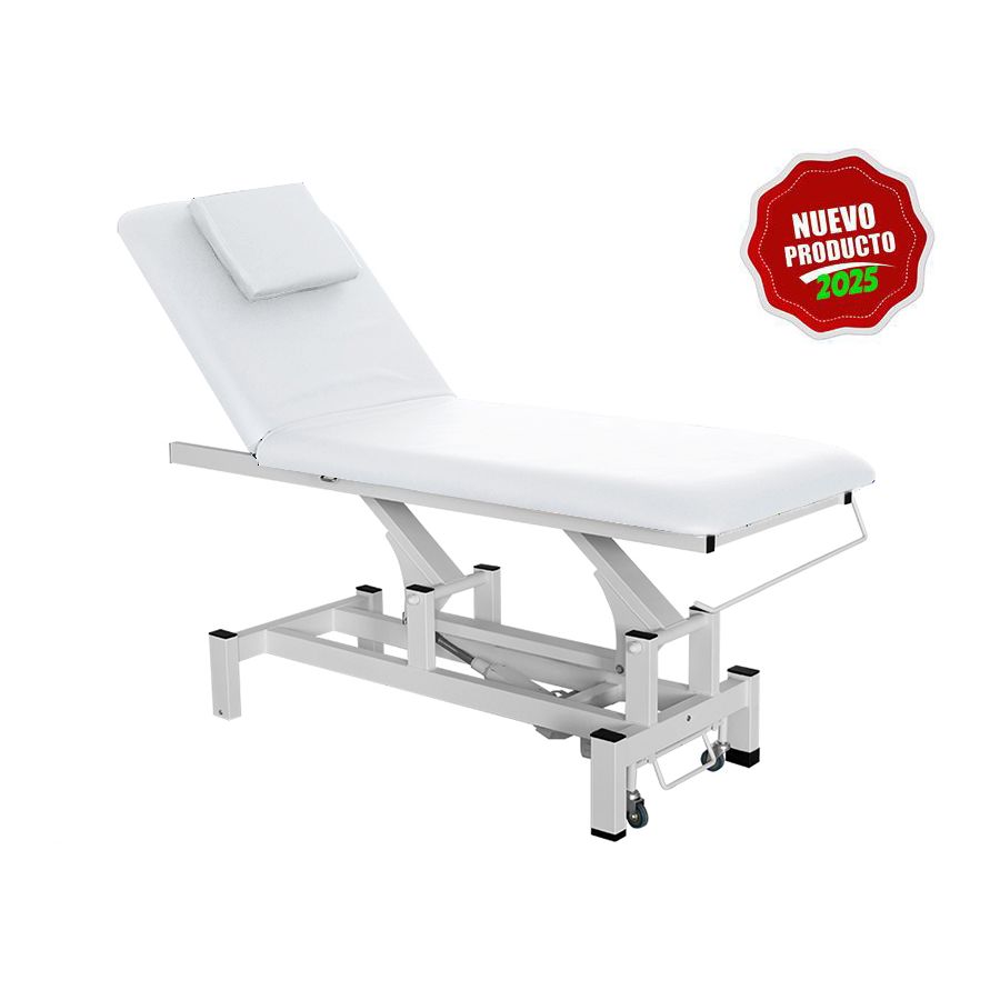 La camilla de masaje eléctrica está dividida en 2 secciones y es regulable en altura, para lo que dispone de 1 Motor de elevación que permite regular la altura de la camilla mediante la botonera integrada en la estructura. Además, el ángulo del respaldo es ajustable mediante pistón de gas. Por otra parte, la camilla dispone de un reposacabezas extraíble que deja al descubierto un practico agujero facial así como una robusta estructura metálica con ruedas escamoteables que facilitan su desplazamiento, y ha sido diseñada con unos acabados de máxima calidad, un tapizado en PVC color blanco y un acolchado de alta densidad. También disponible con tapizado en color negro (consultar).