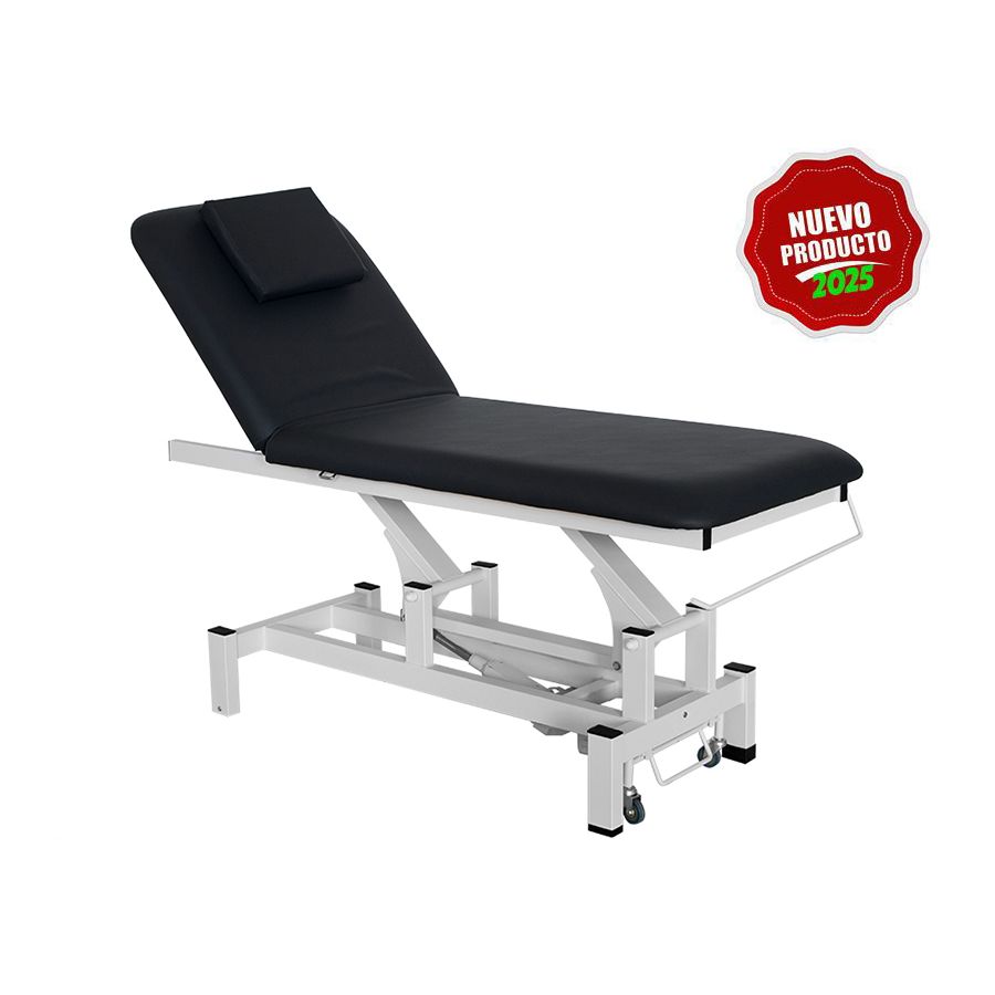 La camilla de masaje eléctrica está dividida en 2 secciones y es regulable en altura, para lo que dispone de 1 Motor de elevación que permite regular la altura de la camilla mediante la botonera integrada en la estructura. Además, el ángulo del respaldo es ajustable mediante pistón de gas. Por otra parte, la camilla dispone de un reposacabezas extraíble que deja al descubierto un practico agujero facial así como una robusta estructura metálica con ruedas escamoteables que facilitan su desplazamiento, y ha sido diseñada con unos acabados de máxima calidad, un tapizado en PVC y un acolchado de alta densidad.
