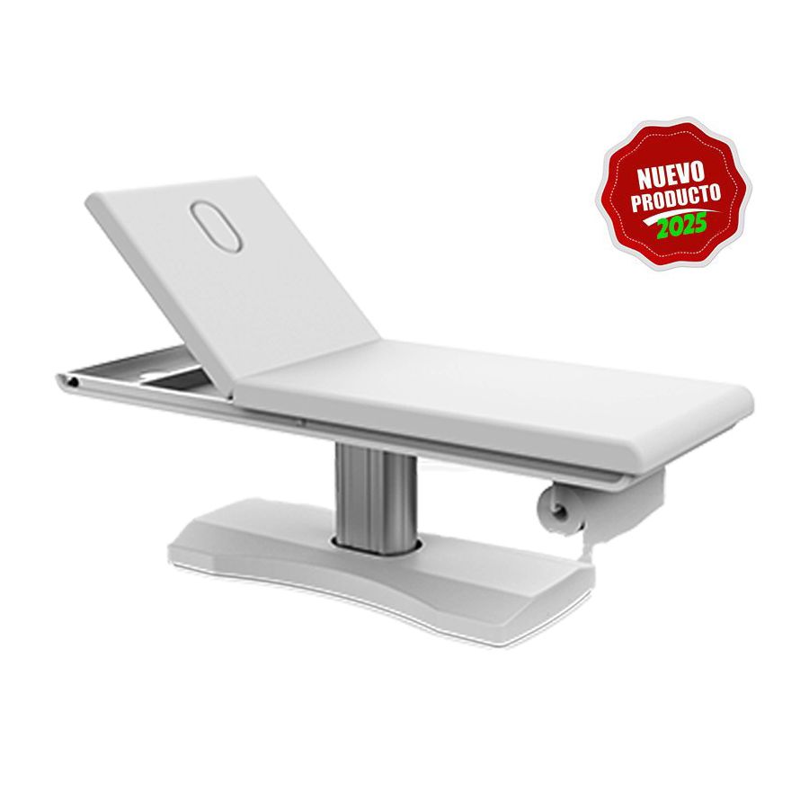 La camilla de masaje eléctrica Antita White está dividida en 2 secciones y dispone de 1 Motor de elevación que permite regular la altura desde una botonera que tiene integrada en la propia estructura. Además, la camilla dispone de un respaldo regulable en inclinación mediante pistón de gas, que dispone de un practico agujero facial. Esta camilla ha sido diseñada con unos acabados de máxima calidad, y dispone de un tapizado en PU en color blanco, así como un acolchado de alta densidad y un práctico portarrollos incorporado.
