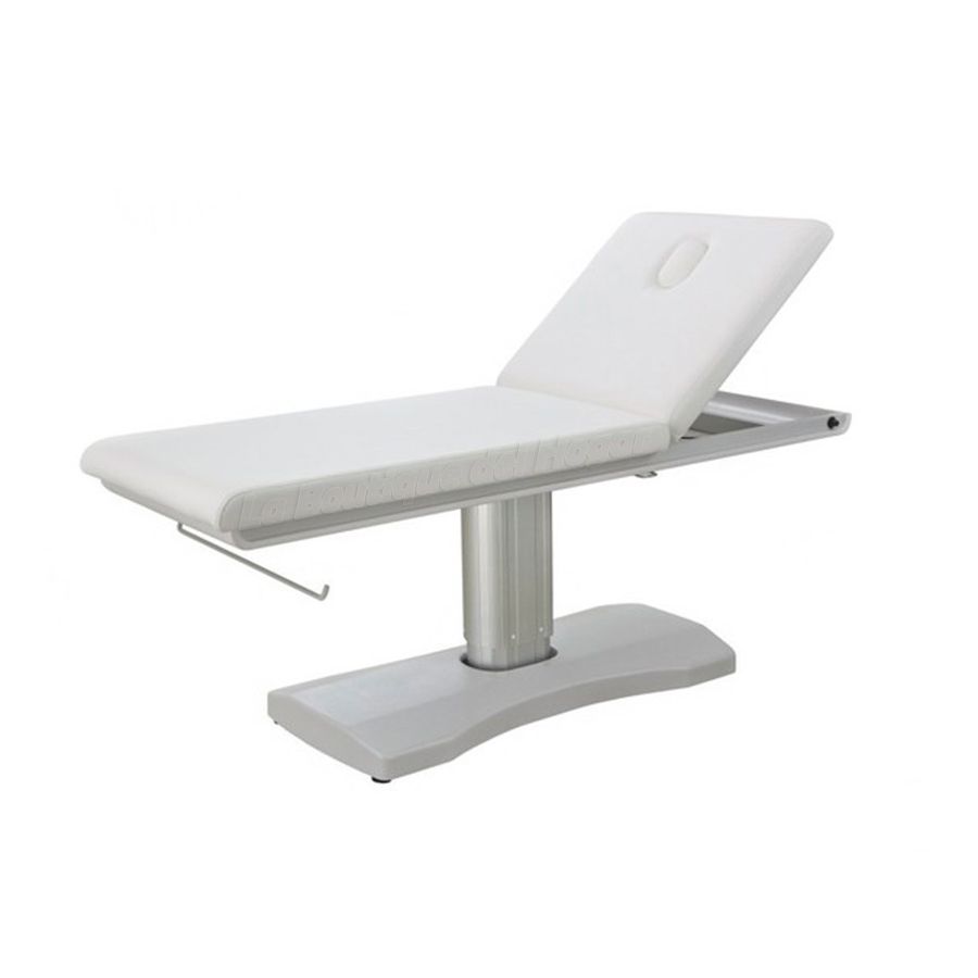 La camilla de masaje eléctrica Hern Modelo 2247T está dividida en 2 secciones y dispone de 1 Motor de elevación que permite regular la altura desde una botonera que tiene integrada en la propia estructura. Además, la camilla dispone de un respaldo regulable en inclinación mediante pistón de gas, que dispone de un practico agujero facial. Esta camilla ha sido diseñada con unos acabados de máxima calidad, y dispone de un tapizado en PU en color blanco, así como un acolchado de alta densidad y un práctico portarollos incorporado.