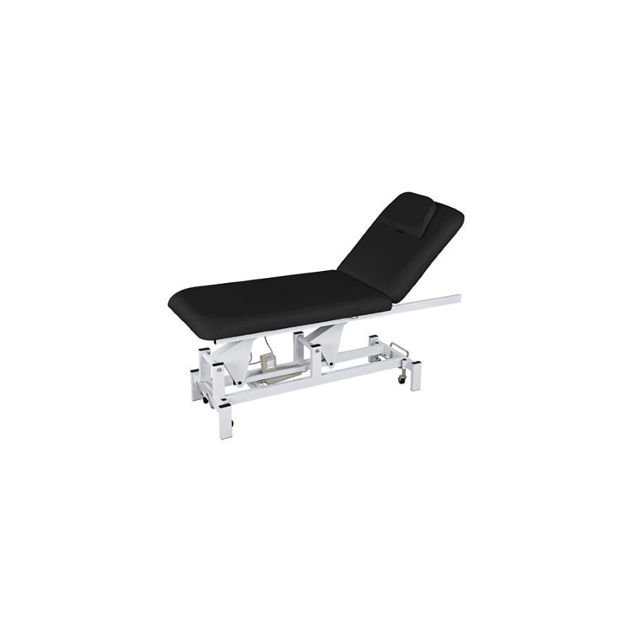 La camilla de masaje eléctrica está dividida en 2 secciones y es regulable en altura, para lo que dispone de 1 Motor de elevación que controla la altura de la camilla. Además, el ángulo del respaldo es ajustable mediante pistón de gas. Por otra parte, la camilla dispone de un reposacabezas extraíble que deja al descubierto un practico agujero facial así como una robusta estructura metálica con ruedas escamoteables que facilitan su desplazamiento, y ha sido diseñada con unos acabados de máxima calidad, un tapizado en PVC y un acolchado de alta densidad.