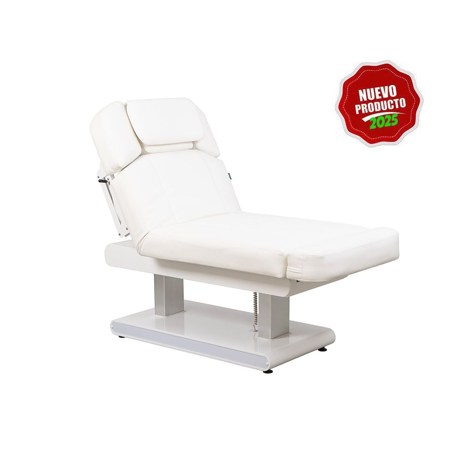 La Camilla de SPA Modelo Atlant con calefacción integrada, incorpora de 4 motores que regulan la altura, el respaldo, el reposapiés y la inclinación total con máxima suavidad y silencio. Además, cuenta con un colchón multicapa de gran grosor con calefacción de doble intensidad, y tapizado PU blanco de alta calidad. Su base dispone de una robusta estructura de madera con LED multicolor, y su cabezal extraíble, está dotado con agujero facial con un práctico cojín rectangular para una máxima comodidad.