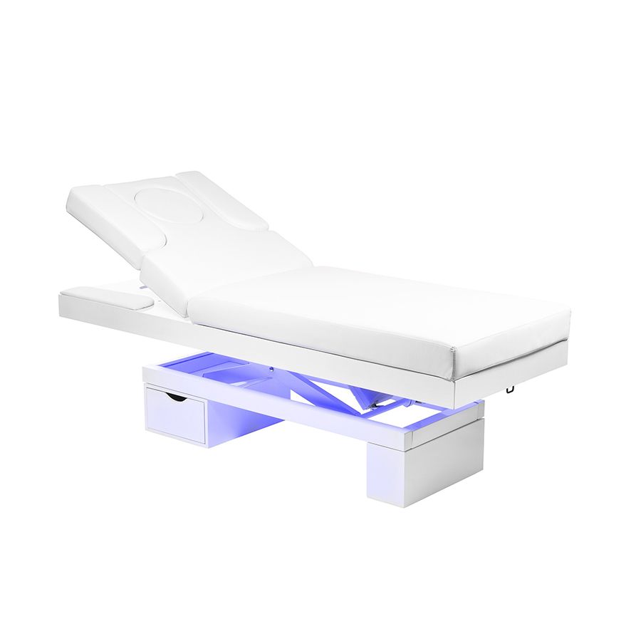 La Camilla SPA Modelo Limb Warm es una camilla de altas prestaciones que consta de 2 motores que regulan la altura y la inclinación del respaldo. La camilla incorpora Calefacción y dispone de reposabrazos extraíbles, cabezal con agujero facial con set de 2 cojines, así como portarrollos incorporado. Además, la Camilla Limb Warm incorpora un colchón con 2 secciones, con un acolchado de gran confort, y un tapizado en PU blanco de gran calidad. La base de la camilla incluye también un práctico cajón de almacenaje, además de un sistema de iluminación LED de colores intercambiables que puede adaptarse a cada centro.