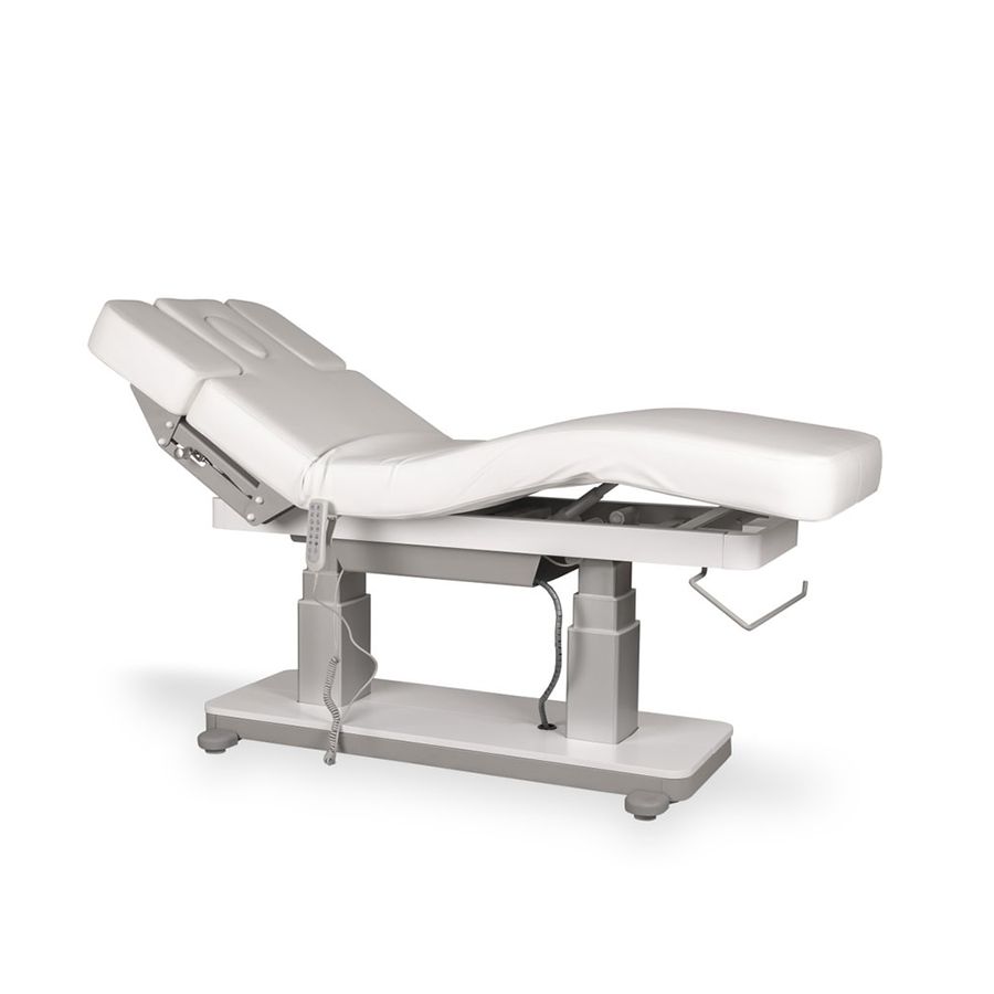 La Camilla SPA Modelo Virgo 4W GR es una camilla de altas prestaciones que consta de 4 motores que permiten regular la altura, la inclinación del respaldo y del apoyapiés, y la inclinación del asiento. La camilla dispone de un colchón con un alcolchado de gran confort con tapizado PU blanco de gran calidad, además de un reposacabezas con agujero facial.