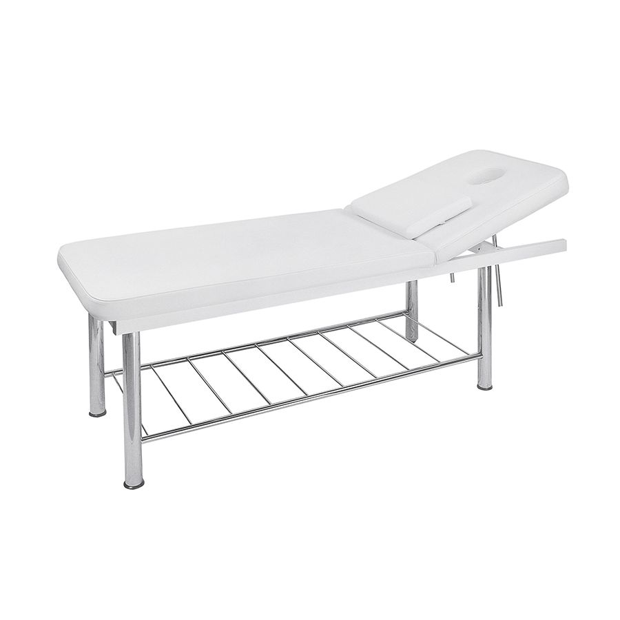 La camilla de masaje está dividida en 2 secciones y dispone de un respaldo regulable mecánicamente así como un reposacabezas extraíble que deja al descubierto un practico agujero facial. Además, dispone de una robusta estructura metálica fija con bandeja inferior para almacenaje, que le otorga una gran estabilidad, y ha sido diseñada con unos acabados de máxima calidad, un tapizado en PVC de fácil limpieza y un acolchado de alta densidad.