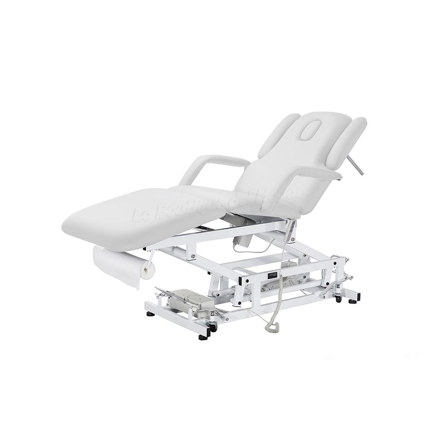 La Camilla Acrum 2234A es una camilla de de altas prestaciones que consta de 3 motores que regulan la altura, la inclinación del respaldo y del módulo central. Además, dispone de apoyabrazos regulables, reposacabezas con agujero facial y cojín postural adicional, estructura metálica y ruedas escamoteables que facilitan su desplazamiento. La Camilla ha sido diseñada con unos acabados de máxima calidad y cuenta con tapizado blanco en PU de gran calidad y fácil limpieza, así como un acolchado de alta densidad y portarrollos incorporado.