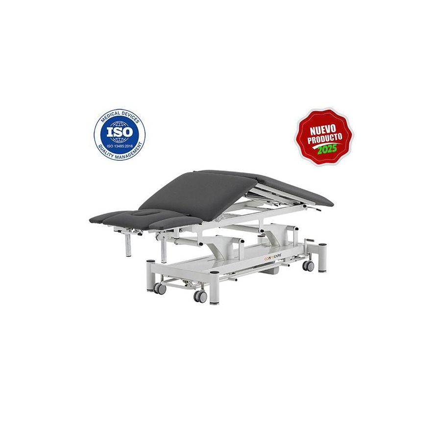 La Camilla Nott de Coinfycare, es una camilla de fisioterapia Premium multifuncional de altas prestaciones de 5 secciones para una amplia gama de tratamientos. La camilla cuenta con estructura metálica y está equipada con reposabrazos en cabezal, ajustables en altura para asegurar la mejor posición cuando el paciente está tumbado en posición ventral. Dispone de 2 motores que regulan el ajuste de la altura de la camilla y la cifosis eléctrica, también incluye portarrollos de serie, además de 4 ruedas grandes retráctiles para facilitar el movimiento. Además, la inclinación del respaldo y del reposapiés se regula mediante pistón de gas, siempre en base la exigencia del trabajo a realizar.