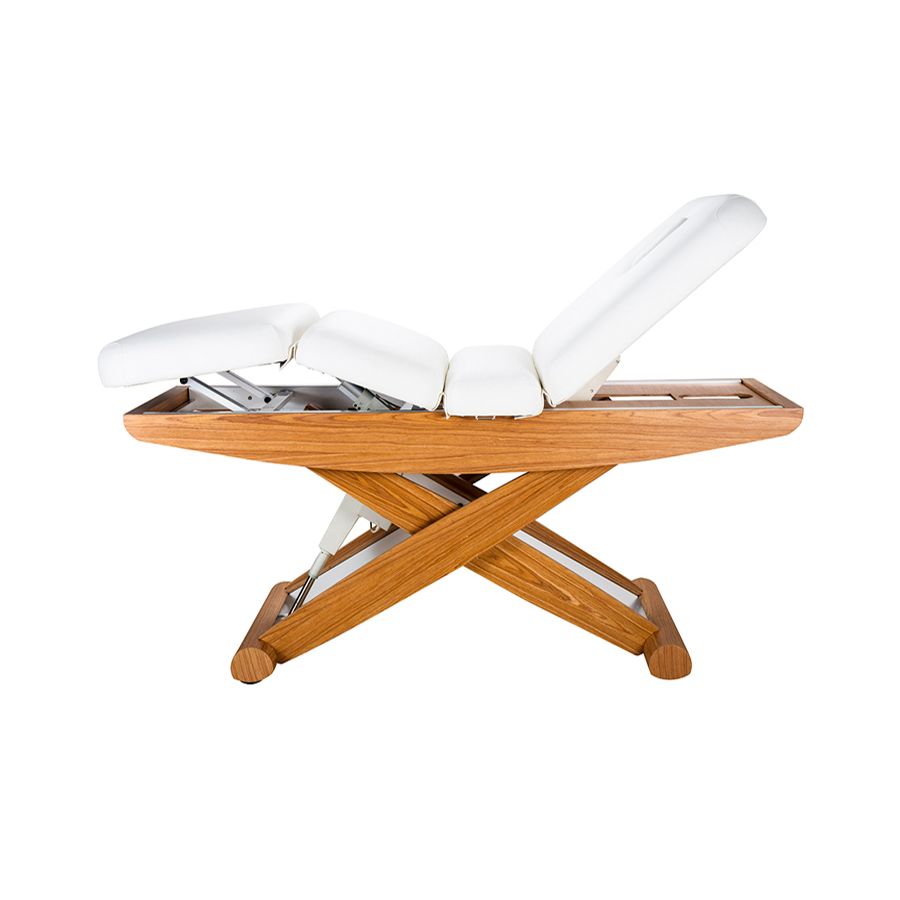 La camilla de masaje está dividida en varias secciones y equipada con 3 motores que controlan la altura y la inclinación del respaldo y del módulo central de la camilla. Además, la camilla Cyx dispone de una robusta estructura metálica en forma de tijera con acabado de madera color natural, y ha sido diseñada con unos materiales de máxima calidad, un tapizado en PU blanco de facil limpieza y un acolchado de alta densidad.