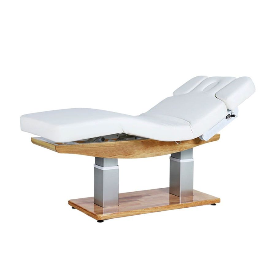 La Camilla Troch es una camilla SPA de altas prestaciones que consta de una única pieza con 3 secciones y 4 motores que regulan la altura, la inclinación del respaldo, del reposapiés y de toda la camilla. Además, la camilla cuenta con reposabrazos ajustables y cabezal con agujero facial. Pero no solo eso, la camilla Troch Smart dispone de una estructura metálica con acabado de madera color natural, así como un acolchado ultrablando de 12 cm de acolchado de gran confort con tapizado PU blanco de alta calidad.