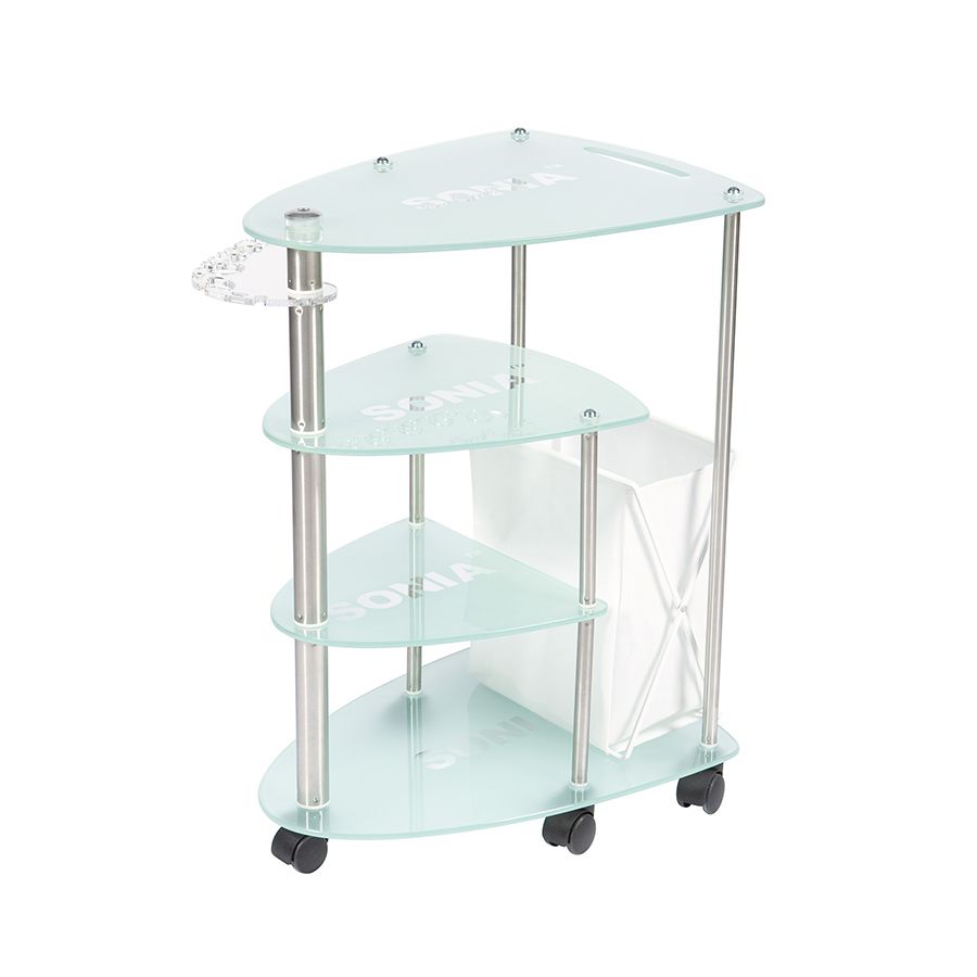 El Carrito Modelo Nekka ha sido fabricado con una estructura metálica y baldas de vidrio, y dispone de un soporte para instrumentos, así como una práctica bolsa para tirar los restos de producto. Además, cuenta con una total movilidad gracias a las cinco ruedas de las que dispone.