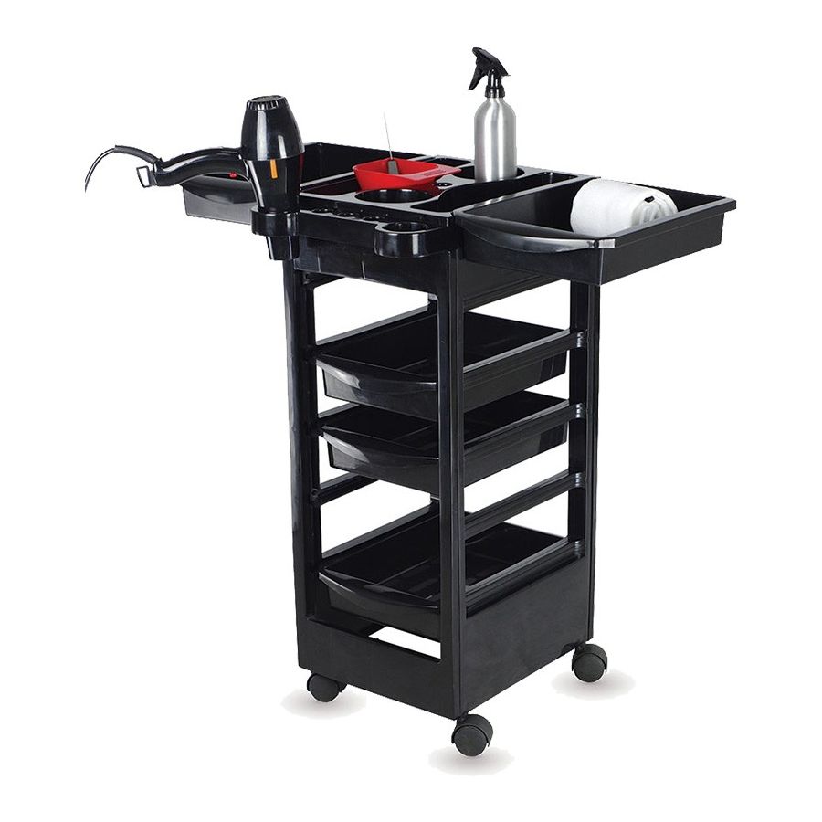 El Carrito auxiliar de peluquería Modelo Adam dispone de un elegante diseño en color negro fabricado en polipropileno, que incorpora 5 bandejas cajonera extraíbles, perfectas para el almacenamiento de los accesorios y herramientas de trabajo, así como 2 bandejas pueden quedar suspendidas de los laterales superiores del carro, además de una parte superior del área de trabajo con varios compartimentos y soportes para aparatos. Por tanto, resulta una excelente opción para garantizar la organización de los materiales en una peluquería o salón de belleza.