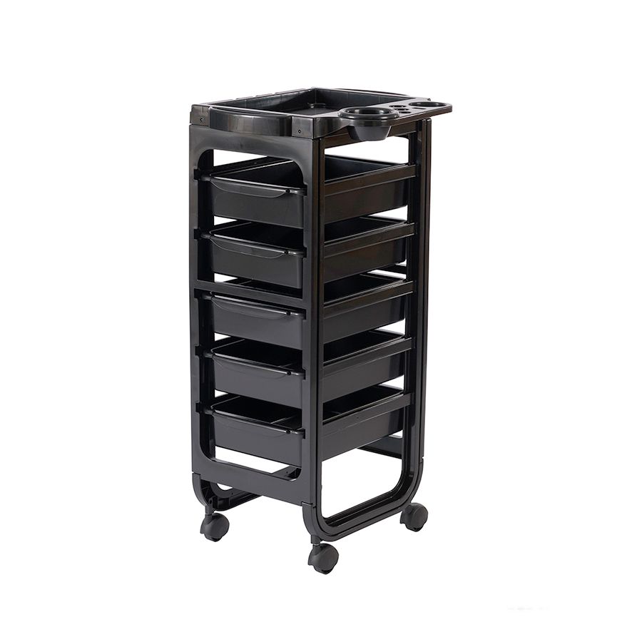 El Carrito auxiliar de peluquería Comby Modelo RZ-T003 dispone de un elegante diseño en color negro, que incorpora 5 bandejas cajonera extraíbles y bandeja superior, perfectas para el almacenamiento de los accesorios y herramientas de trabajo, por lo que resulta una excelente opción para garantizar la organización de los materiales en una peluquería o salón de belleza. El carrito está dotado también de una pequeña bandeja lateral adicional, así como estructura lateral abierta y unas practicas asas laterales en la parte superior superior.