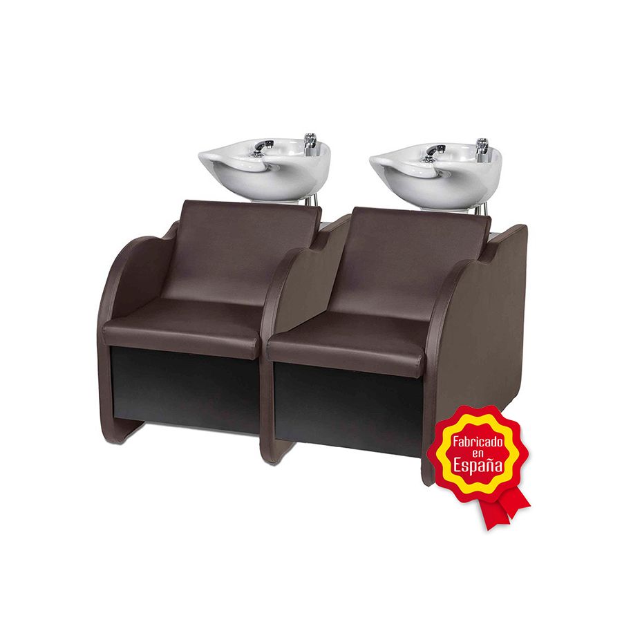 Se trata de un Lavacabezas Doble de diseño elegante, que dispone de un brazo intermedio, para una mayor sensación de confort, e incorpora dos picas de cerámica en color blanco que se adaptan a la nuca dando una sensación de relax. El sillón del Lavacabezas incorpora una encimera de aluminio pintada al poliester, asi como una balda interior para botellas, y dispone de un elegante tapizado en polipiel premium de alta calidad, con un diseño ergonómico que se adapta perfectamente al cuerpo de la persona, otorgándole un máximo confort.