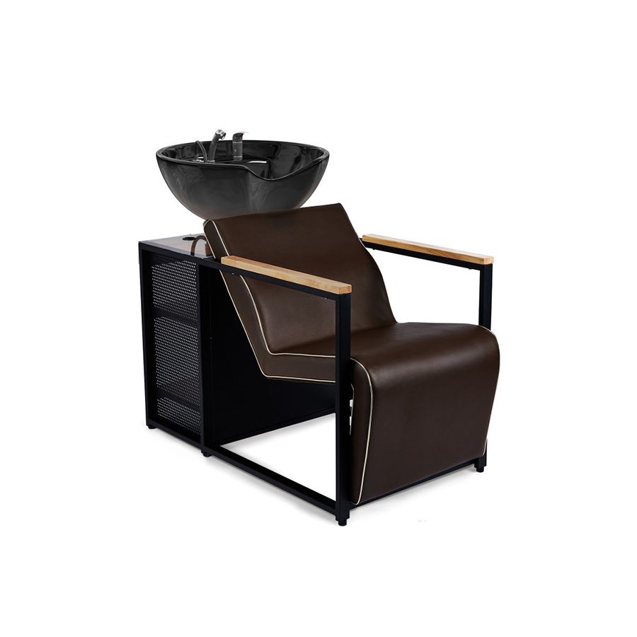 Se trata de un Lavacabezas individual de diseño elegante, que dispone de estructura metálica galvanizada y pintada, con unos prácticos y elegantes reposabrazos con acabados en madera de roble maciza, e incorpora una pica de cerámica basculante en color blanco, que se adapta a la nuca aportando una agradable sensación de relax. El sillón del Lavacabezas dispone un elegante y llamativo diseño, con asiento y respaldo ergonómico, tapizado en polipiel de PVC color marrón retardante al fuego de gran calidad, espuma fabricada en alta densidad para una rápida recuperación a su estado inicial, y gran resistencia, y se adapta perfectamente al cuerpo de la persona, otorgándole un máximo confort. Además, el Lavacabezas dispone de una cómoda y práctica estanteria en la parte anterior con panel resistente al agua, para almacenar útiles.