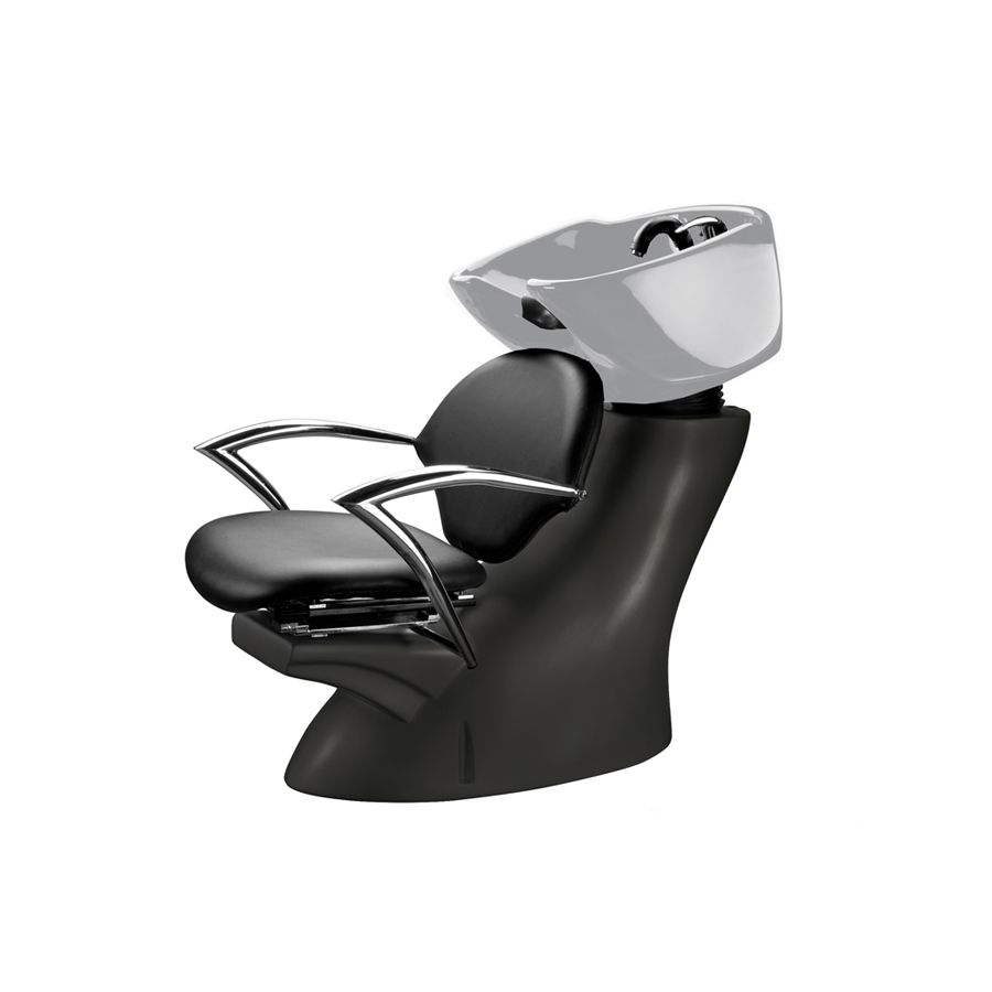 Se trata de un Lavacabezas individual de diseño elegante, con base fabricada en fibra de vidrio negra, que dispone de unos prácticos y elegantes reposabrazos cromados, e incorpora una pica de cerámica color blanco, montada sobre mecanismo oscilante, que se adapta a la nuca aportando una agradable sensación de relax. El sillón del Lavacabezas dispone un elegante diseño, con tapizado en polipiel color negro de alta calidad y gran resistencia, con espuma de alta densidad de recuperación rápida, que se adapta perfectamente al cuerpo de la persona, otorgándole un máximo confort. También disponible con pica de cerámica en color negro y con base en color plateado (Consultar).