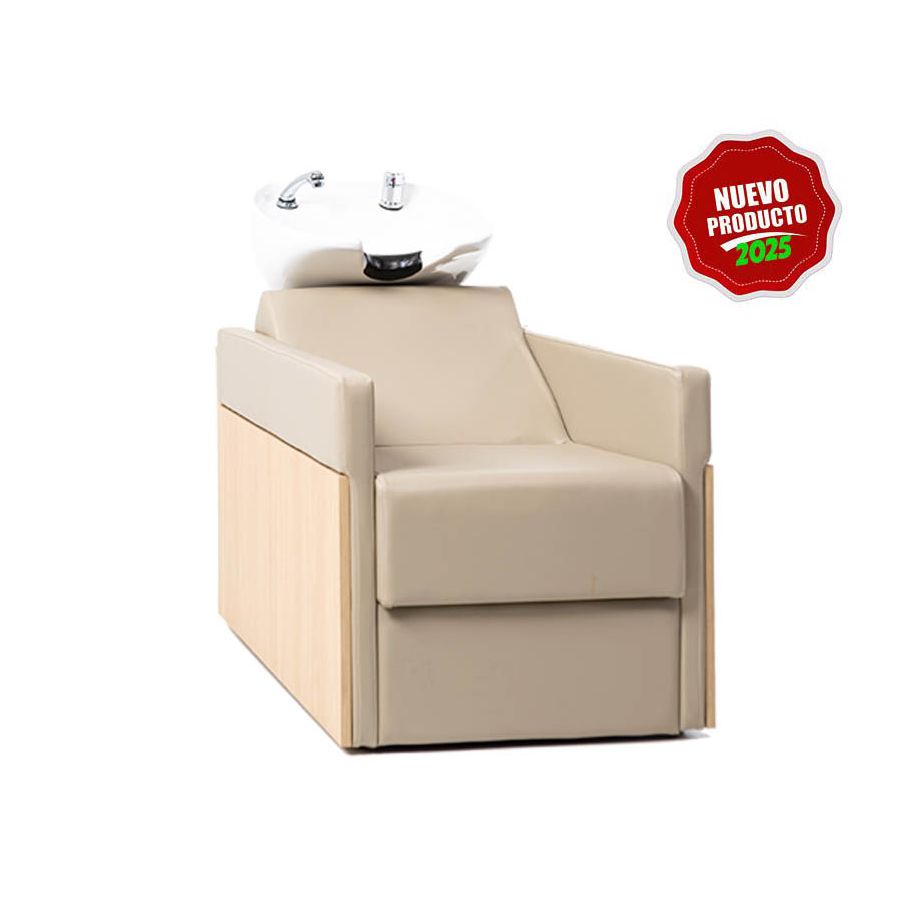 Lavacabezas con pica blanca y respaldo ergonómico en madera y polipiel Modelo Rustik - Color Beige