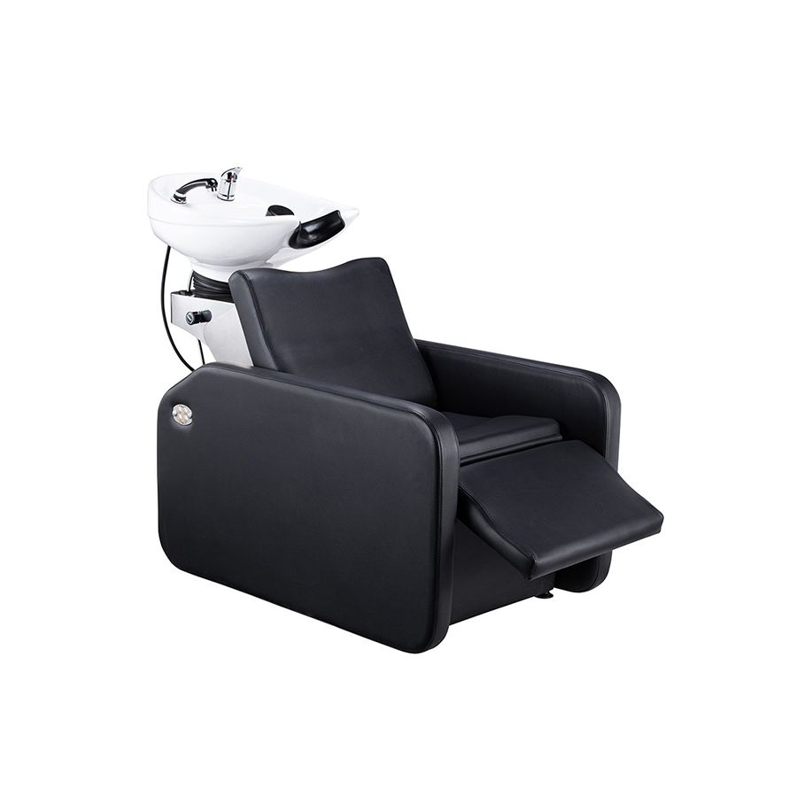 Se trata de un Lavacabezas individual de diseño robusto y elegante, que dispone de un práctico respaldo y reposapiés eléctricos controlados por 2 motores diferentes, para accionarlos por separado. Además, dispone de asiento y respaldo ergonómicos, así como unos cómodos reposabrazos, para una mayor sensación de máximo confort, e incorpora una pica de cerámica en color blanco o negro montada sobre mecanismo oscilante, y ajustable vertical y horizontalmente con embellecedor de goma, que se adapta a la nuca otorgando una cómoda sensación de relax. El sillón del Lavacabezas está fabricado con una robusta estructura metálica pintada en color negro, y dispone de un elegante tapizado en polipiel color negro de alta calidad y gran resistencia con espuma de 35 Kg de densidad y retardarte al fuego, que aportará un toque de estilo a su peluquería.