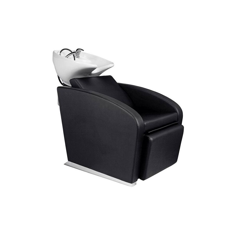 Se trata de un Lavacabezas individual de diseño robusto y elegante, que dispone de un práctico reposapies eléctrico, así como unos cómodos reposabrazos, para una mayor sensación de máximo confort, e incorpora una pica de cerámica basculante en color blanco, con embellecedor metálico para la cerámica, que se adapta a la nuca otorgando una cómoda sensación de relax. El sillón del Lavacabezas dispone un elegante tapizado en polipiel color negro de alta calidad y gran resistencia, que combina con un elegante zócalo embellecedor en acero, que aportará un toque de estilo a su peluquería.