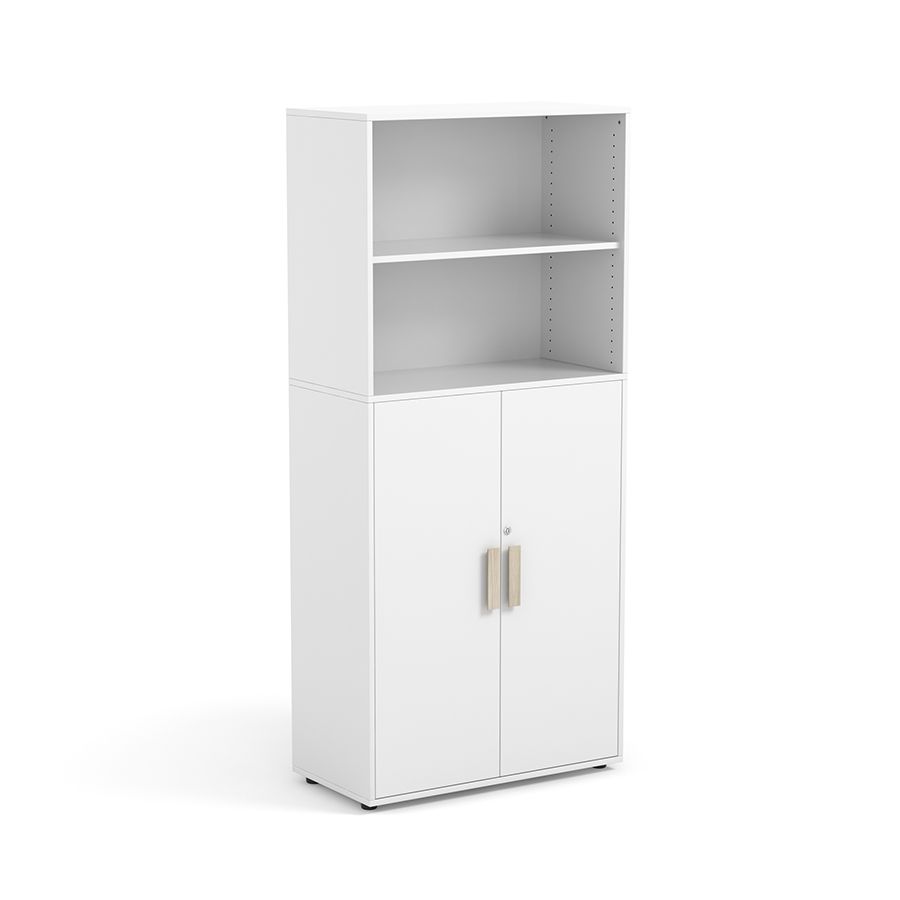 Se trata de un práctico y llamativo Mueble armario modular de doble altura con 2 estantes superiores y 2 puertas en la parte inferior, fabricado con estructura de tablero de aglomerado de alta densidad de 19 mm de espesor, recubierto con papel melaminico blanco. El armario Maud cuenta en la parte inferior con un armario de dos puertas con cerradura, con un amplio espacio de almacenamiento interior, así como dos estantes abiertos superiores, regulables en altura. Además, el armario doble incluye 4 niveladores para poder adaptarlo a los pequeños desniveles del suelo.
