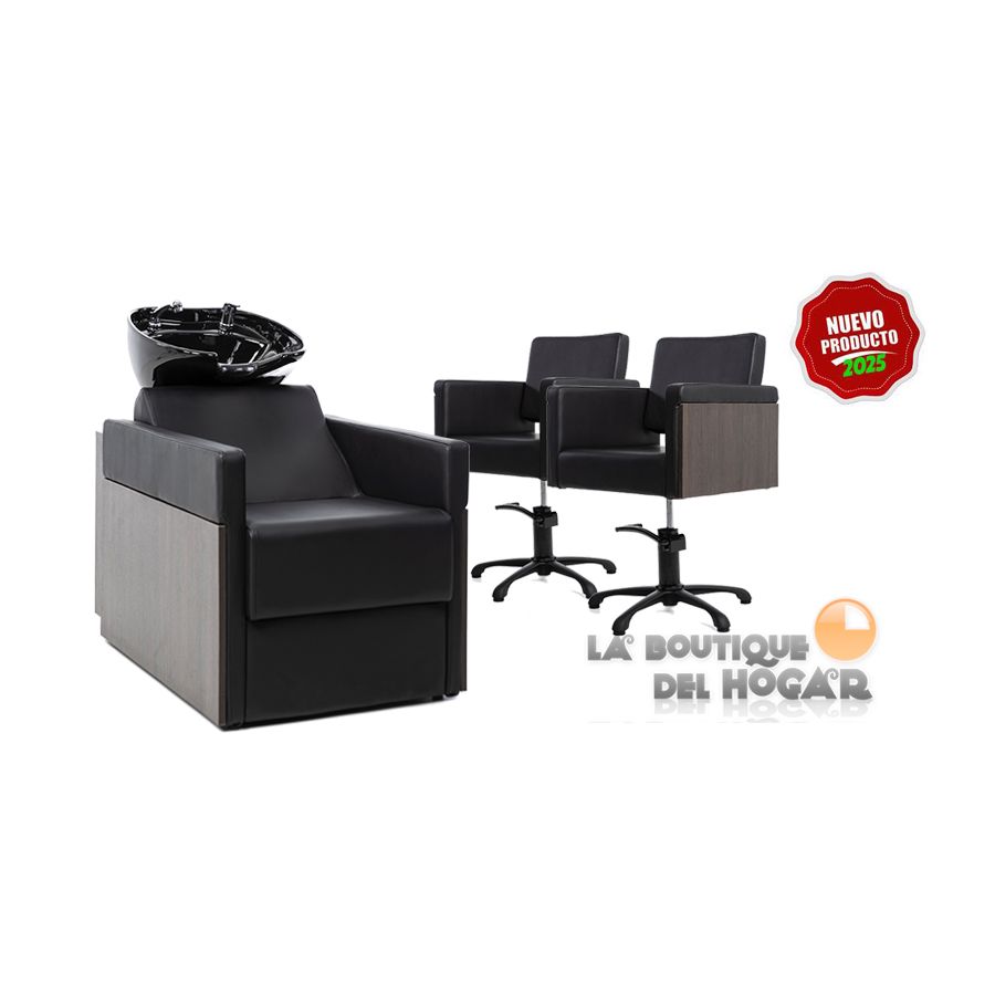 Pack - 1 Lavacabezas Con Pica Negra Rustik + 2 Sillones De Corte Rustik en madera y polipiel - Color Negro