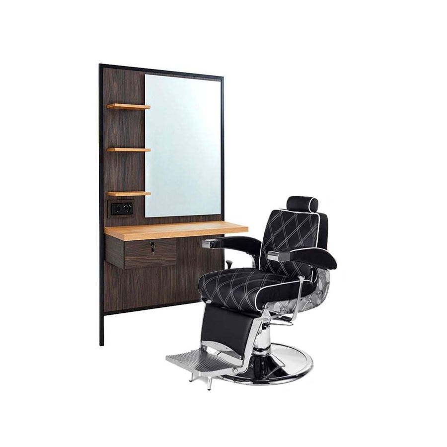 Este Pack incluye 1 Tocador de Barbería con cajón y estantes Modelo Logan B Black. El Tocador de Barbería Modelo Logan Black está elaborado con materiales de la más alta calidad, con estructura de chapa de madera natural con molduras de madera maciza barnizada. El Tocador incorpora un panel frontal con espejo con luz, así como 3 baldas pequeñas en el lateral, un estante principal, y un cajón con cerradura, aportando un toque de estilo y distinción a su barbería.