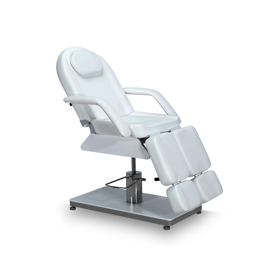Se trata de un robusto y funcional sillón camilla de tres cuerpos regulable en altura mediante bomba de aceite de elevación ajustable, que dispone de una estructura metálica con base también metálica. Equipado con 4 barras de trinquete para ajustar la inclinación del respaldo y la inclinación del los pedales. El sillón camilla mensa dispone además, de un elegante tapizado en PU en color blanco, muy fácil de limpiar.