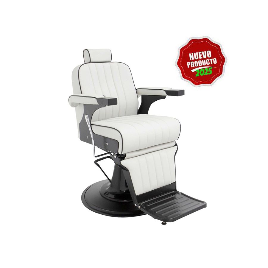 Se trata de un elegante Sillón hidráulico reclinable, giratorio y regulable en altura, que dispone de un diseño ergonómico y elegante de estilo retro, que también incorpora reposabrazos, así como reposapies inclinable, y reposacabezas ajustable, además de un tapizado en PVC retardante al fuego de alta calidad en color blanco, con acolchado de gran confort y detalles en relieve. Su respaldo puede ser inclinado mediante una palanca lateral, y la estructura del apoyapiés también se inclinará para dar el máximo confort. La silla cuenta con un mecanismo para bloquear la rotación, lo que asegura que permanezca en una posición fija durante los servicios. Además, su asiento puede girar 360 grados, lo que facilita el trabajo del barbero sin tener que mover la silla.
