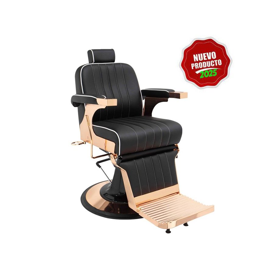 Se trata de un elegante Sillón hidráulico reclinable, giratorio y regulable en altura, que dispone de un diseño ergonómico y elegante de estilo retro, que también incorpora reposabrazos, así como reposapies inclinable, y reposacabezas ajustable, además de un tapizado en PVC retardante al fuego de alta calidad en color negro, con acolchado de gran confort y detalles en relieve. Su respaldo puede ser inclinado mediante una palanca lateral, y la estructura del apoyapiés también se inclinará para dar el máximo confort. La silla cuenta con un mecanismo para bloquear la rotación, lo que asegura que permanezca en una posición fija durante los servicios. Además, su asiento puede girar 360 grados, lo que facilita el trabajo del barbero sin tener que mover la silla.