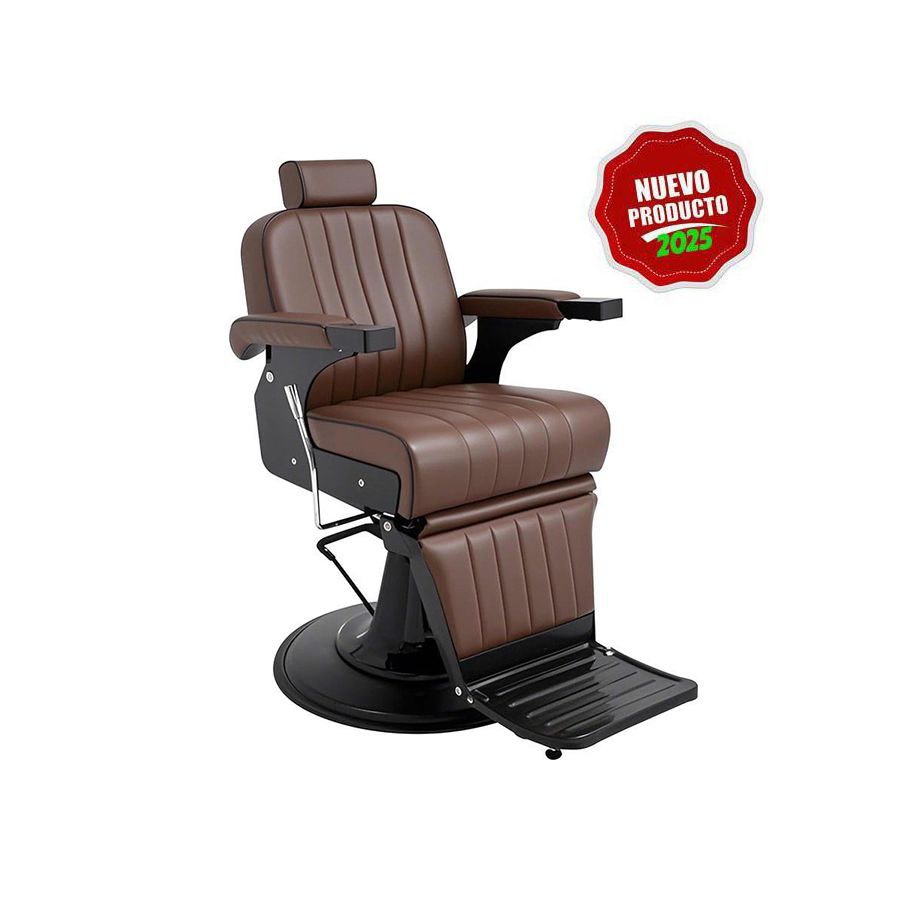 Se trata de un elegante Sillón hidráulico reclinable, giratorio y regulable en altura, que dispone de un diseño ergonómico y elegante de estilo retro, que también incorpora reposabrazos, así como reposapies inclinable, y reposacabezas ajustable, además de un tapizado en PVC retardante al fuego de alta calidad en color marrón, con acolchado de gran confort y detalles en relieve. Su respaldo puede ser inclinado mediante una palanca lateral, y la estructura del apoyapiés también se inclinará para dar el máximo confort. La silla cuenta con un mecanismo para bloquear la rotación, lo que asegura que permanezca en una posición fija durante los servicios. Además, su asiento puede girar 360 grados, lo que facilita el trabajo del barbero sin tener que mover la silla.