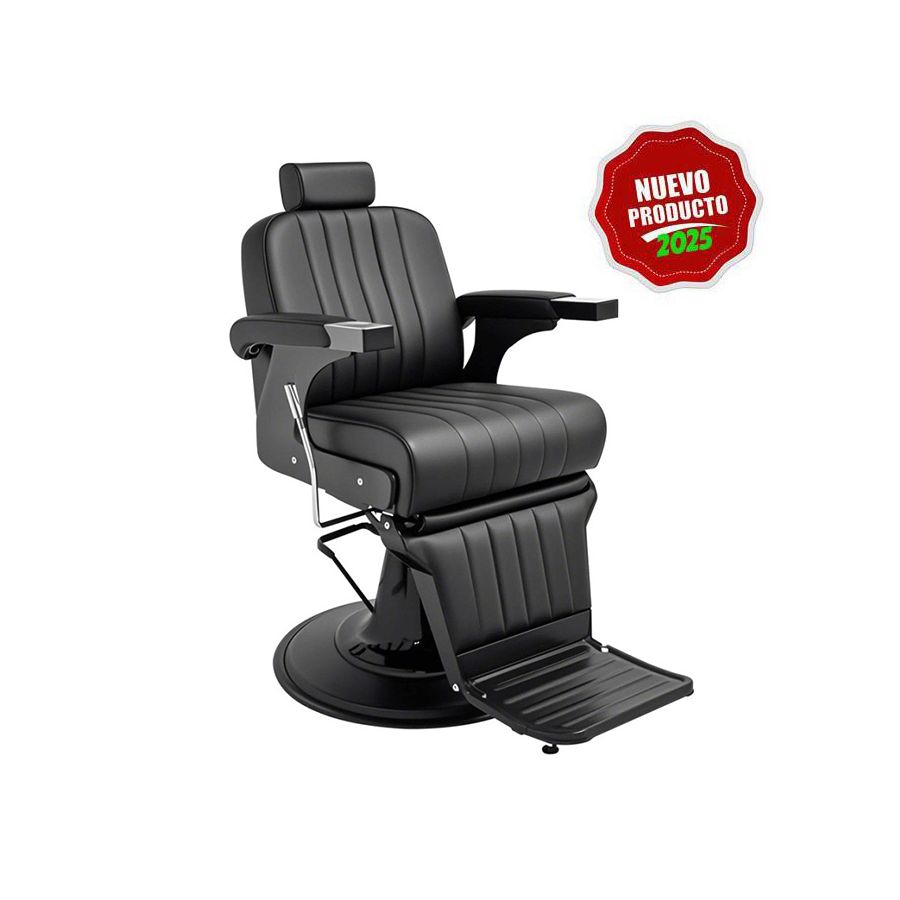 Se trata de un elegante Sillón hidráulico reclinable, giratorio y regulable en altura, que dispone de un diseño ergonómico y elegante de estilo retro, que también incorpora reposabrazos, así como reposapies inclinable, y reposacabezas ajustable, además de un tapizado en PVC retardante al fuego de alta calidad en color negro, con acolchado de gran confort y detalles en relieve. Su respaldo puede ser inclinado mediante una palanca lateral, y la estructura del apoyapiés también se inclinará para dar el máximo confort. La silla cuenta con un mecanismo para bloquear la rotación, lo que asegura que permanezca en una posición fija durante los servicios. Además, su asiento puede girar 360 grados, lo que facilita el trabajo del barbero sin tener que mover la silla.
