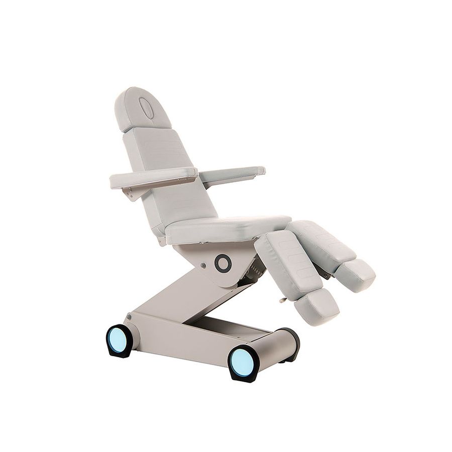 Este sillón de Podología B-Light es altamente configurable y destaca por su diseño innovador que incorpora luz LED blanca integrada en la base. El sillón dispone de 3 motores que controlan la altura, la inclinación del respaldo y del asiento, y ha sido diseñado para optimizar el espacio de trabajo gracias a un su diseño especialmente ideado para maximizar la regulación en altura y un alto confort.