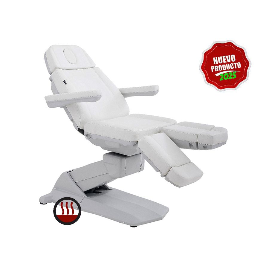 Se trata de un sillón de Podología de alta gama con calefacción, que cuenta con estructura muy estable, dotado de 3 motores que controlan la altura, la inclinación del respaldo y del asiento. Además, el sillón dispone de reposapiés ajustables independientemente mediante pistón de gas que regula su altura, así como reposabrazos extraíbles y abatibles, y reposacabezas regulable. El sillón ha sido diseñado con unos acabados de máxima calidad y cuenta con tapizado blanco en PU de gran calidad y fácil de limpiar así como un acolchado de alta densidad.