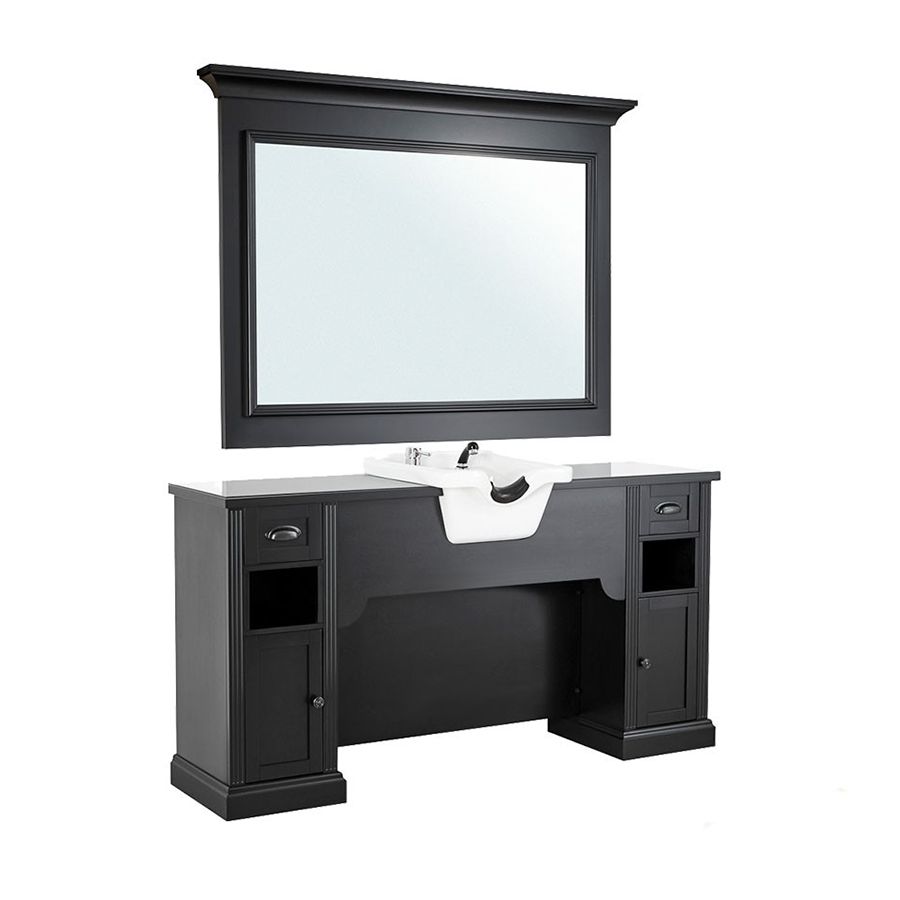 El Tocador de Barbería Vintage con encimera y Lavacabezas Modelo WILLIAM 3B es uno de los Tocadores de barbería más completos, y con más clase y elegancia, que existen actualmente en el mercado. El mueble está elaborado con materiales de la más alta calidad con estructura de chapa de madera natural con molduras de madera maciza barnizada. El Tocador WILLIAM 3B incorpora un lavacabezas de cerámica blanca, además de un panel frontal con espejo central, y diferentes espacios de almacenaje con cajones y puertas, así como una practica encimera con cristal protector para las salpicaduras del agua, aportando un toque de estilo y distinción a su barbería.