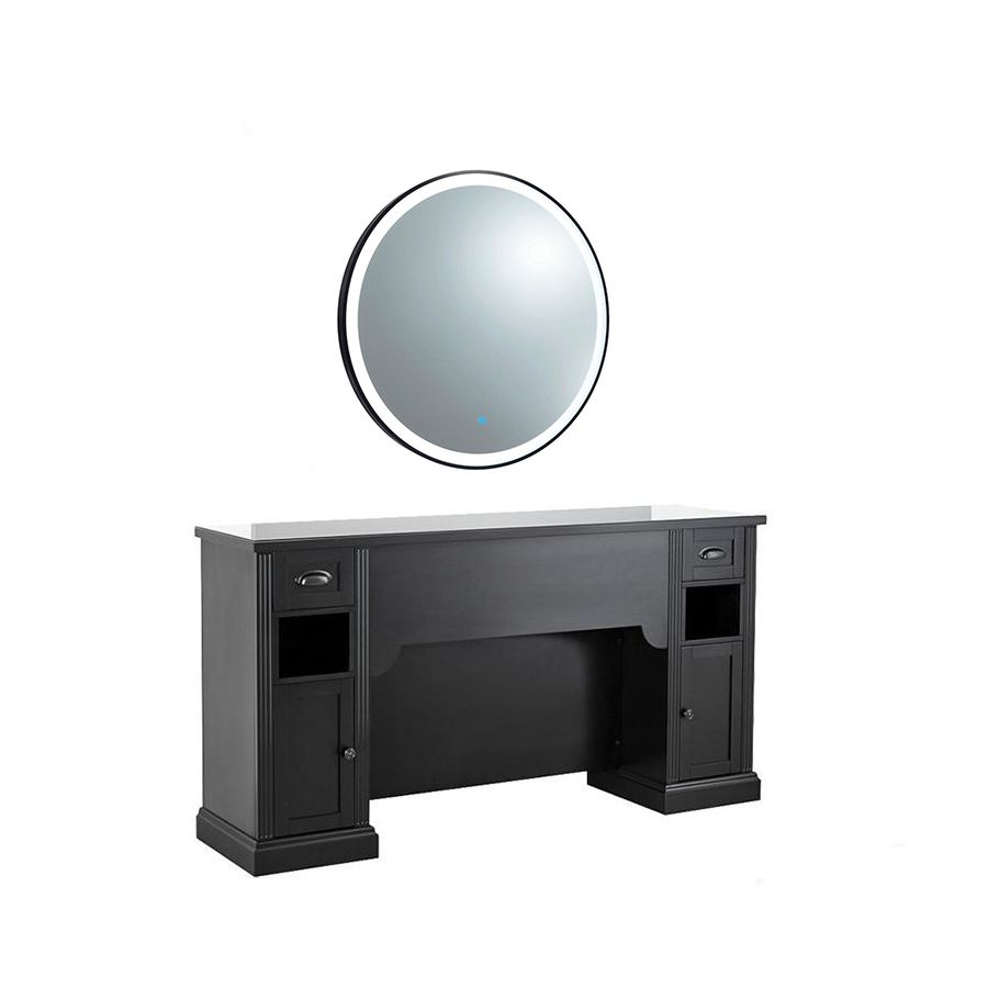 El Tocador de Barbería Vintage con encimera y Mueble Modelo WILLIAM 8B es uno de los Tocadores con más clase y elegancia, que existen actualmente en el mercado. El mueble está elaborado con materiales de la más alta calidad con estructura de chapa de madera natural con molduras de madera maciza barnizada. El Tocador WILLIAM 8B incorpora un espejo central redondo, y un elegante Mueble con diferentes espacios de almacenaje con cajones y puertas, que dispone de una practica encimera con cristal protector para las salpicaduras del agua, aportando un toque de estilo y distinción a su barbería.