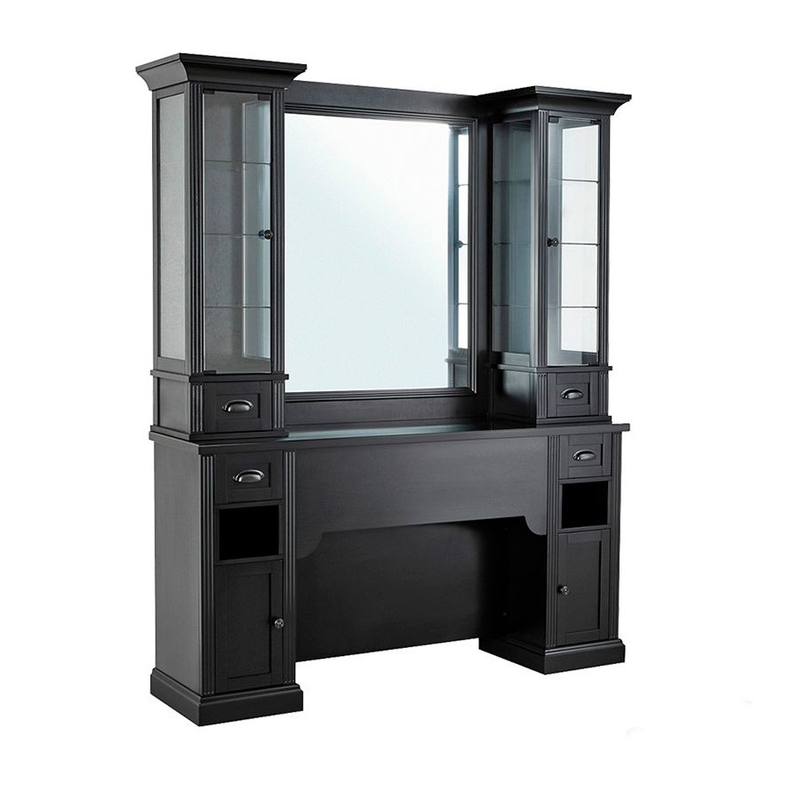 El Tocador de Barbería Vintage con encimera y vitrina expositora Modelo WILLIAM 2B es uno de los Tocadores de barbería más completos, que existen actualmente en el mercado. El mueble está elaborado con materiales de la más alta calidad con estructura de chapa de madera natural con molduras de madera maciza barnizada. El Tocador WILLIAM 2B incorpora un panel frontal con espejo central, así como 2 vitrinas expositoras, con cajones y puertas, y como una practica encimera con cristal protector para las salpicaduras del agua, aportando un toque de estilo y distinción a su barbería.