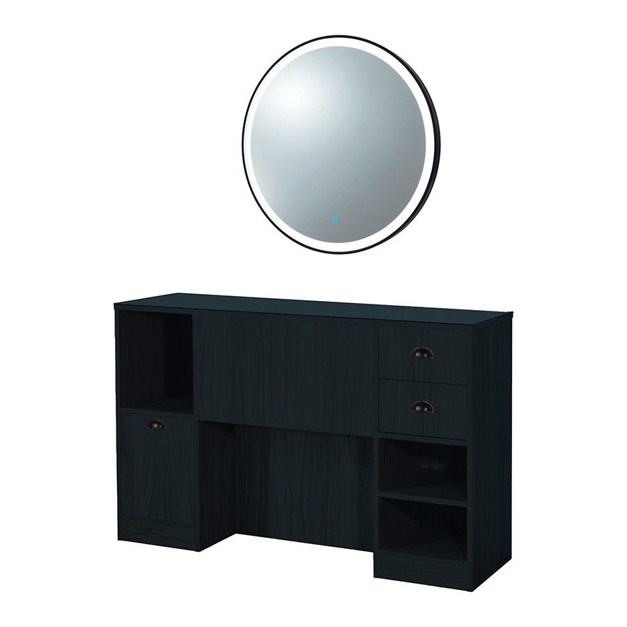 Además, el Tocador de Barbería OKE 6 incorpora un elegante Espejo de diseño redondo, así como una gran cantidad de espacios de almacenaje como son: