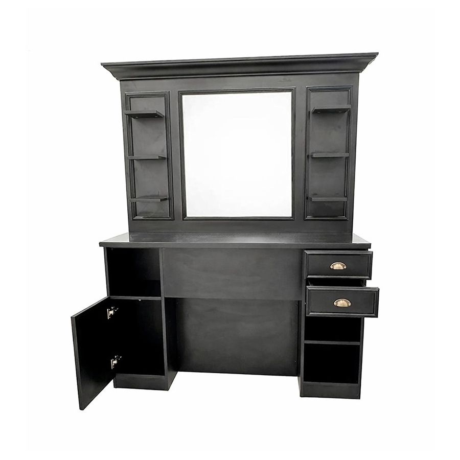 El Tocador de Barbería Vintage con encimera Modelo Bansa W/B cuenta con un elegante color negro, y es uno de los Tocadores de barbería más completo, y con más clase y elegancia, que existen actualmente en el mercado. El mueble está elaborado con materiales de la más alta calidad e incorpora un panel frontal de madera natural en tono color negro con un practico espejo central, una moldura superior de madera maciza, una practica encimera protegida un cristal resistente al agua y unos bonitos tiradores que continúan la línea Vintage de este selecto tocador, que aportará un toque de estilo y distinción a su barbería.