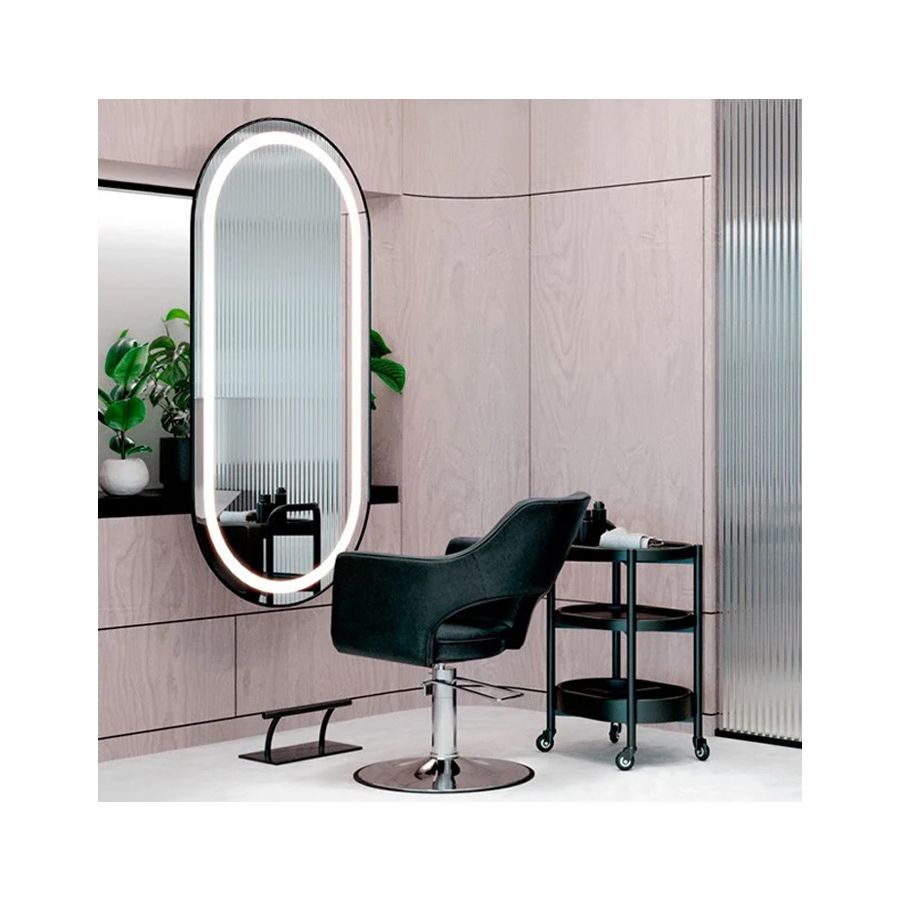 Tocador de Peluquería ovalado estilo Moderno con espejo LED y marco negro Modelo LOOP CB