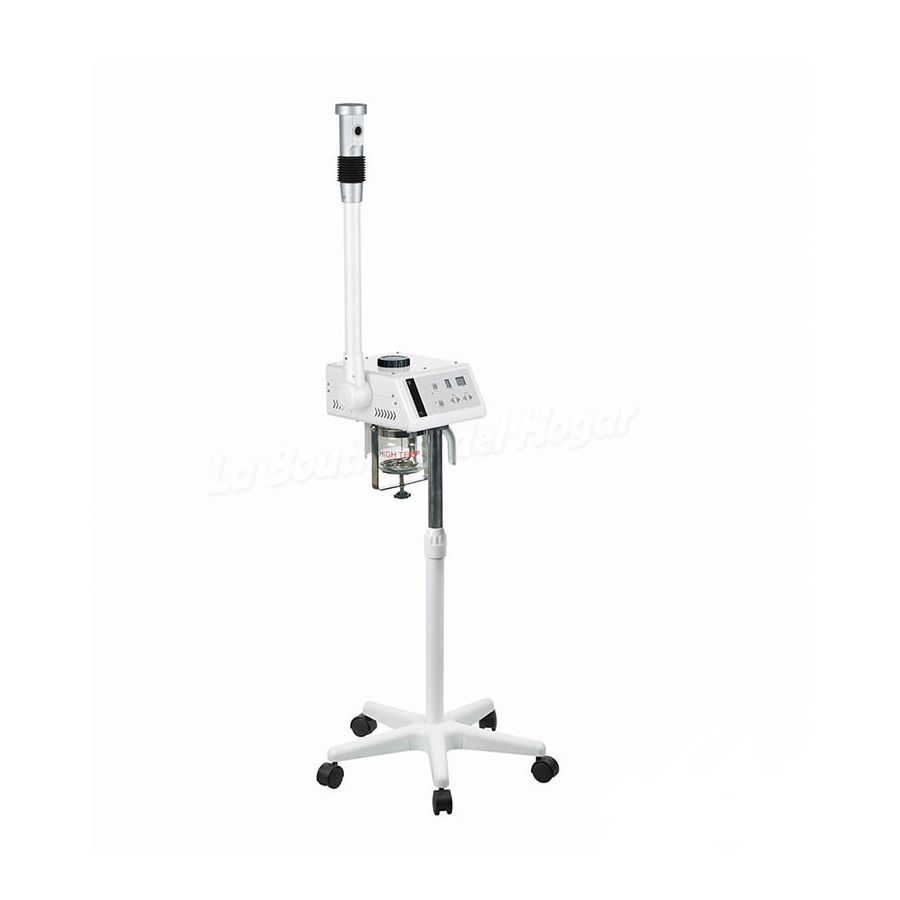 Se trata por tanto de un vaporizador eléctrico de elegante apariencia con estructura metálica en color blanco de gran estabilidad, equipado con cabezal orientable, esenciero y depósito para hierbas. El vaporizador cuenta con un a altura regulable, además de 5 ruedas para su transporte que le aportan gran estabilidad y es ideal tanto para tratamientos estéticos de cutis como para personas con afecciones respiratorias de tipo asma o alergia. Este vaporizador portátil también incluye función de ozono para añadir un efecto antibacteriano de higiene facial, mientras que oxigena la piel.