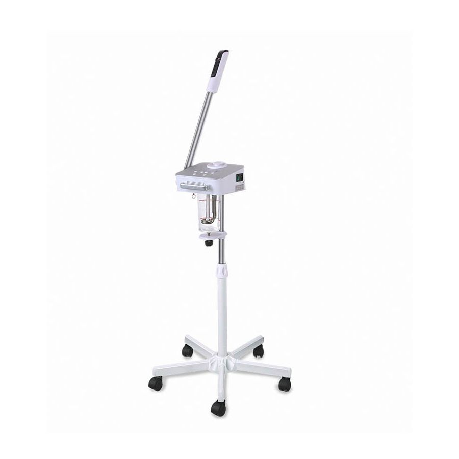 Se trata por tanto de un vaporizador eléctrico de elegante apariencia con estructura metálica en color blanco de gran estabilidad, equipado con cabezal orientable, y recipiente específico para vaporizar aceites esenciales. El vaporizador cuenta con un a altura regulable, además de 5 ruedas para su transporte que le aportan gran estabilidad y es ideal tanto para tratamientos estéticos de cutis como para personas con afecciones respiratorias de tipo asma o alergia. Este vaporizador portátil también incluye función de ozono para añadir un efecto antibacteriano de higiene facial, mientras que oxigena la piel.