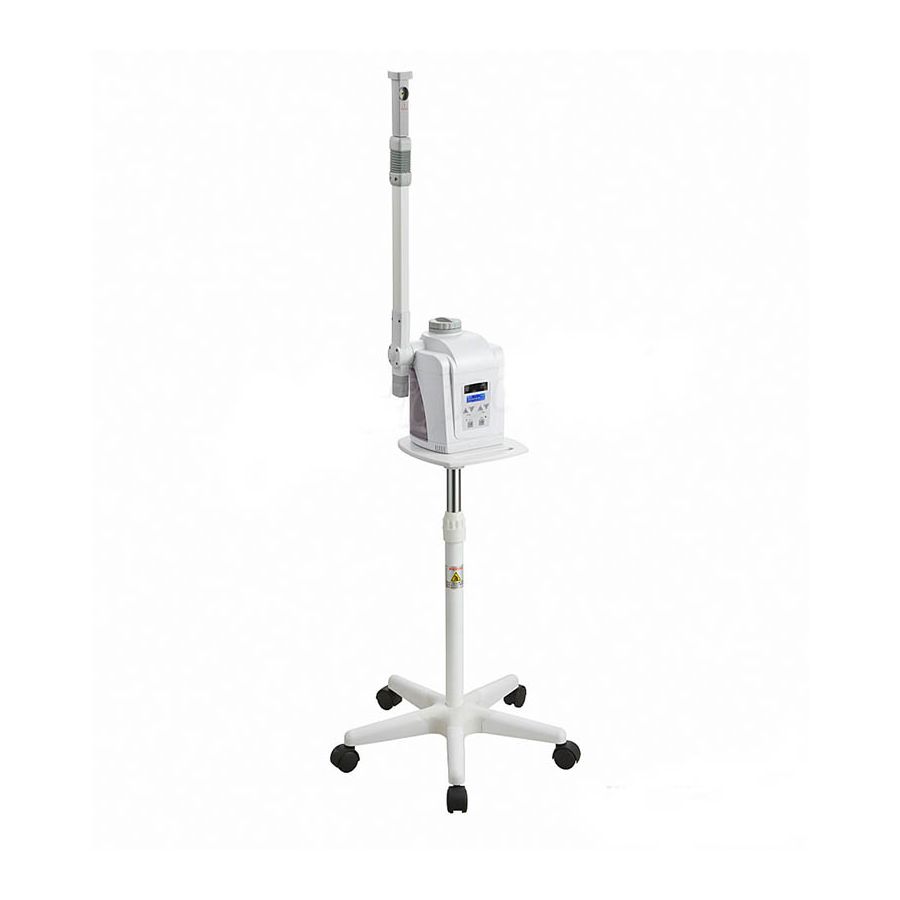 Se trata por tanto de un vaporizador Digital de elegante apariencia en color blanco, un depósito de agua de 1,3 litros de autonomía y con cabezal orientable y giratorio, además de un receptáculo esenciero. El vaporizador cuenta con estructura regulable en altura y 5 ruedas para su transporte que le aportan gran estabilidad y es ideal tanto para tratamientos estéticos de cutis como para personas con afecciones respiratorias de tipo asma o alergia. Este vaporizador portátil también incluye esenciero de fragancias asi como emisión de ozono para añadir un efecto antibacteriano de higiene facial, mientras que oxigena la piel.